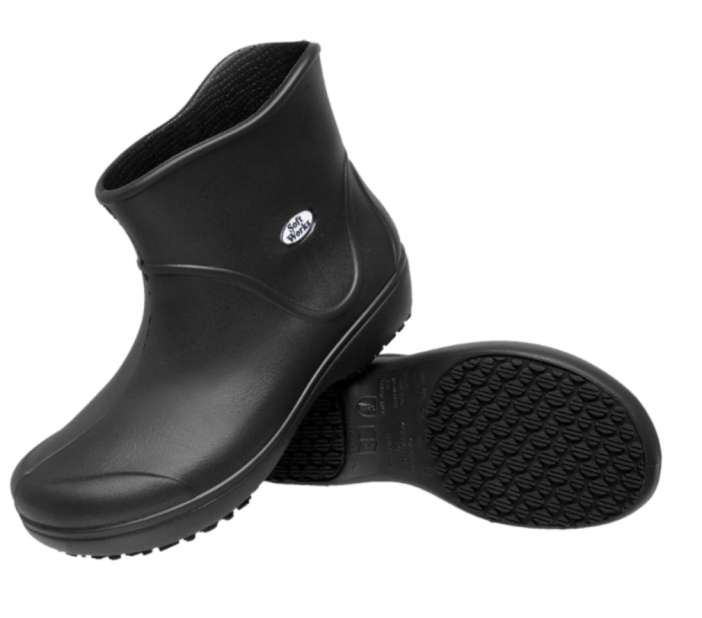 Calçado ocupacional tipo bota de cano curto, confeccionado em EVA nas cores preta ou branca, solado de borracha antiderrapante nas cores, preto ou bege, resistente ao escorregamento em piso cerâmico com solução de detergente e em piso de aço com solução de glicerol, resistente à absorção de energia na área do salto, à isolação contra o frio, à proteção contra produtos químicos e à isolação elétrica.