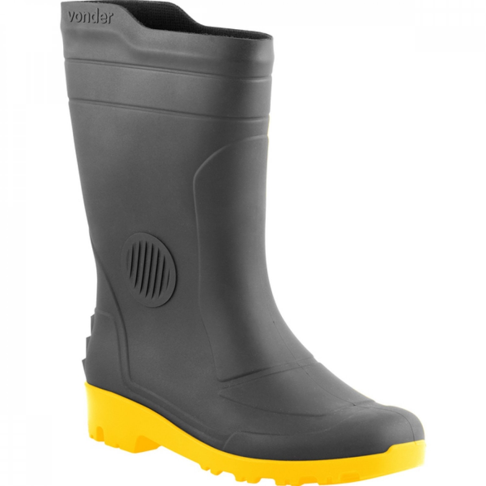 Bota de PVC preta e amarela, cano médio, sem forro.