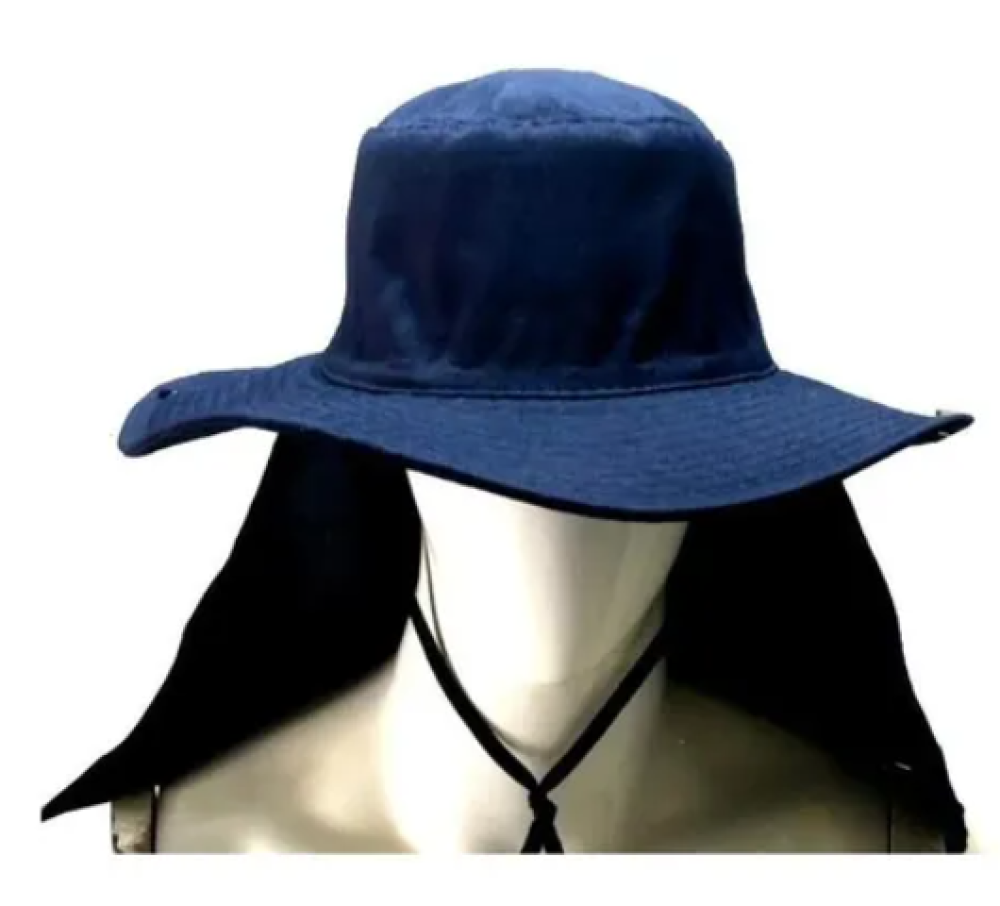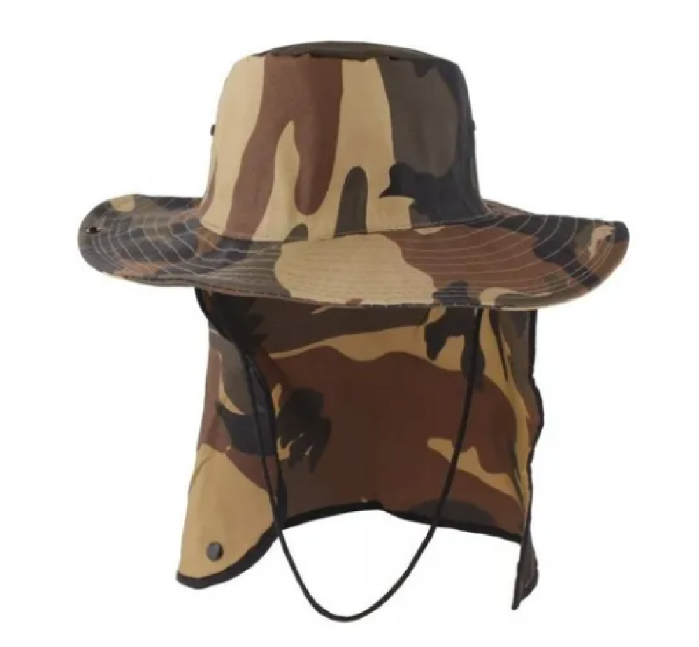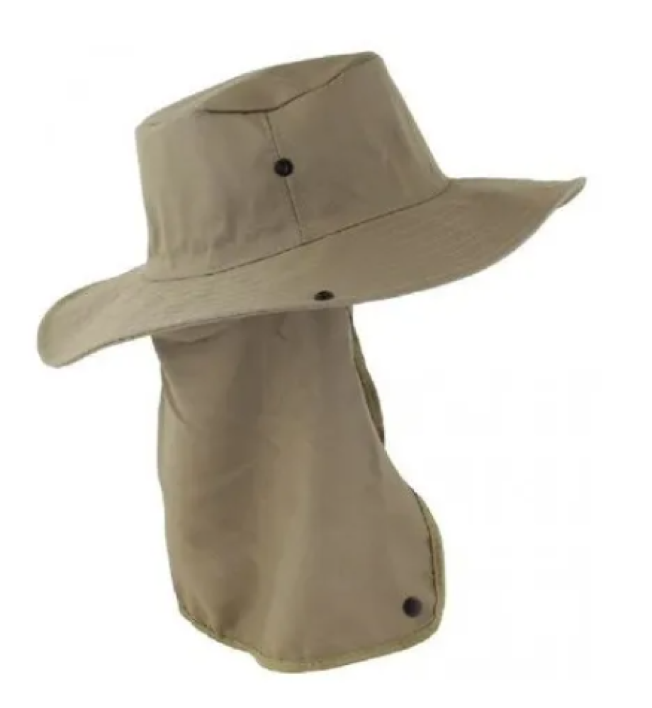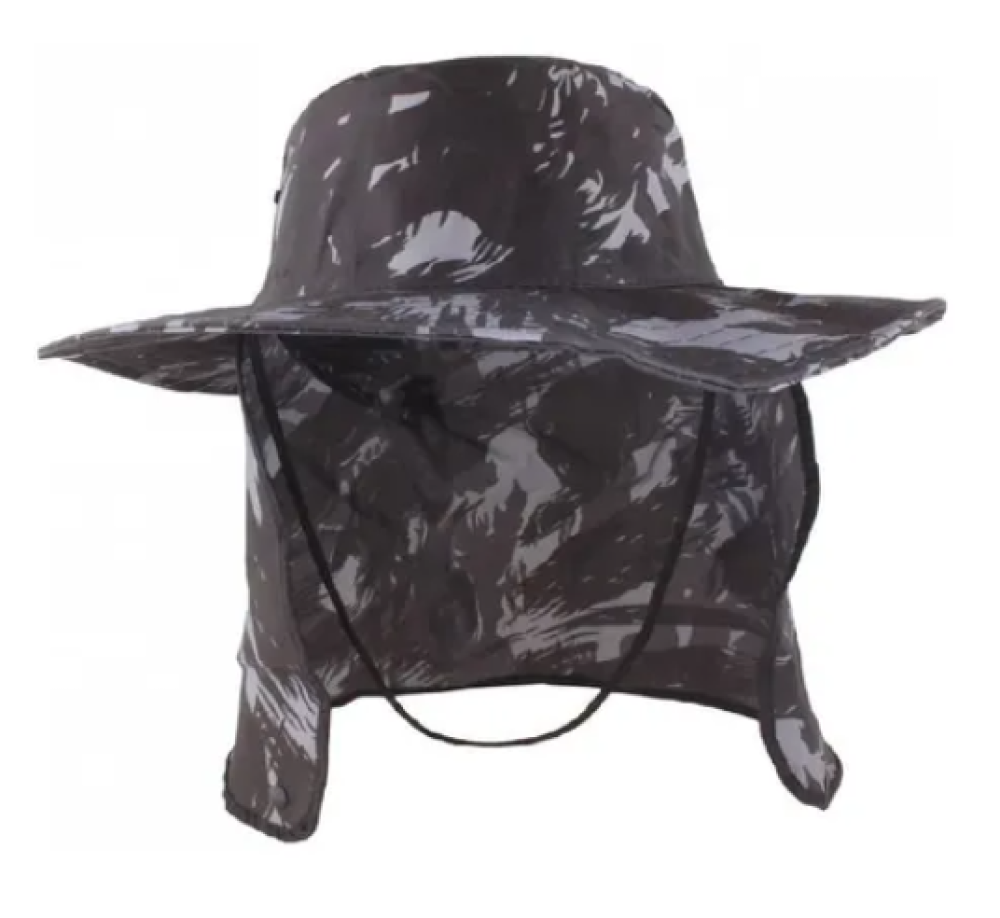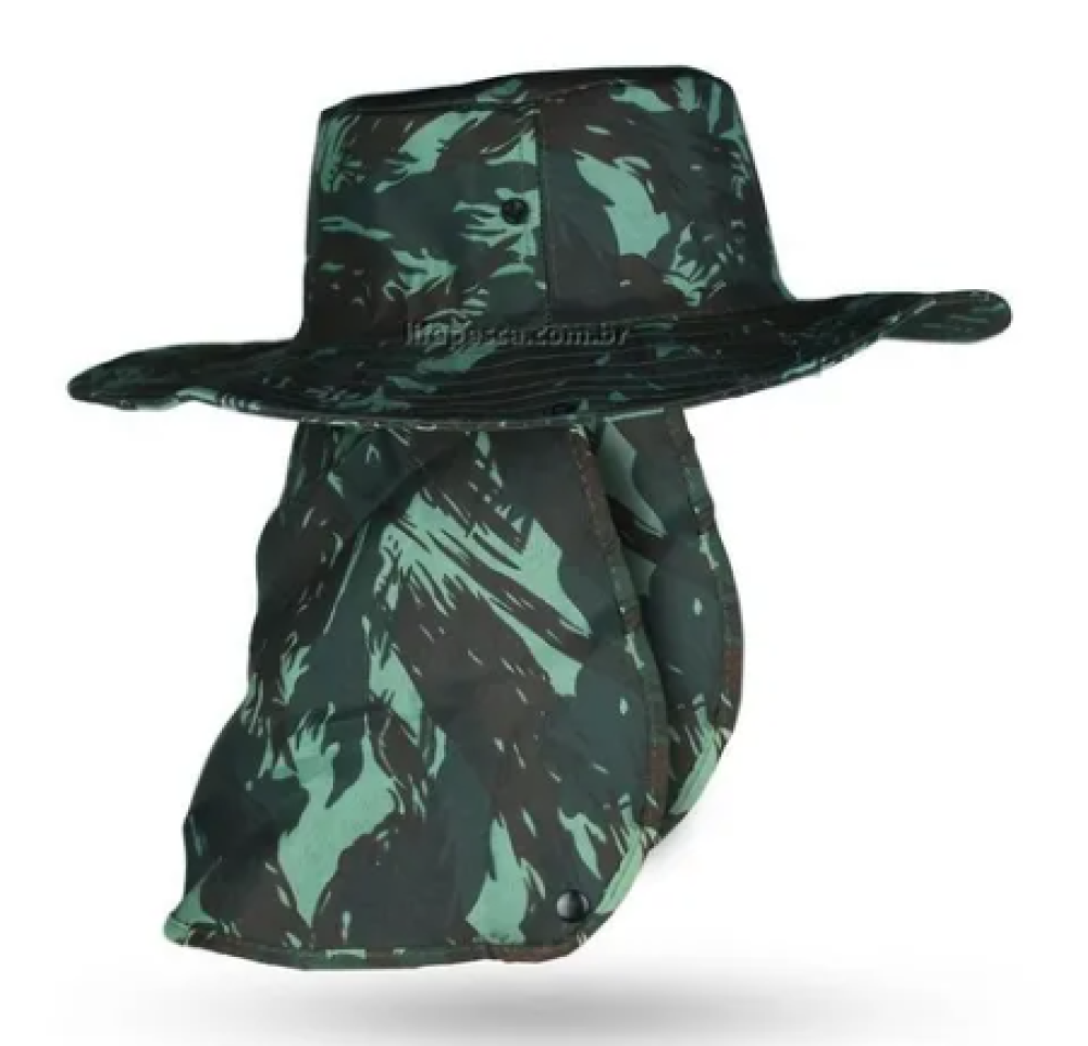Chapéu em tecido 100% poliéster com forro em polipropileno, protetor de nuca com fechamneto frontal com botão.Ajuste na aba com botões nas laterais. Tipo de proteção, safari, pescador.