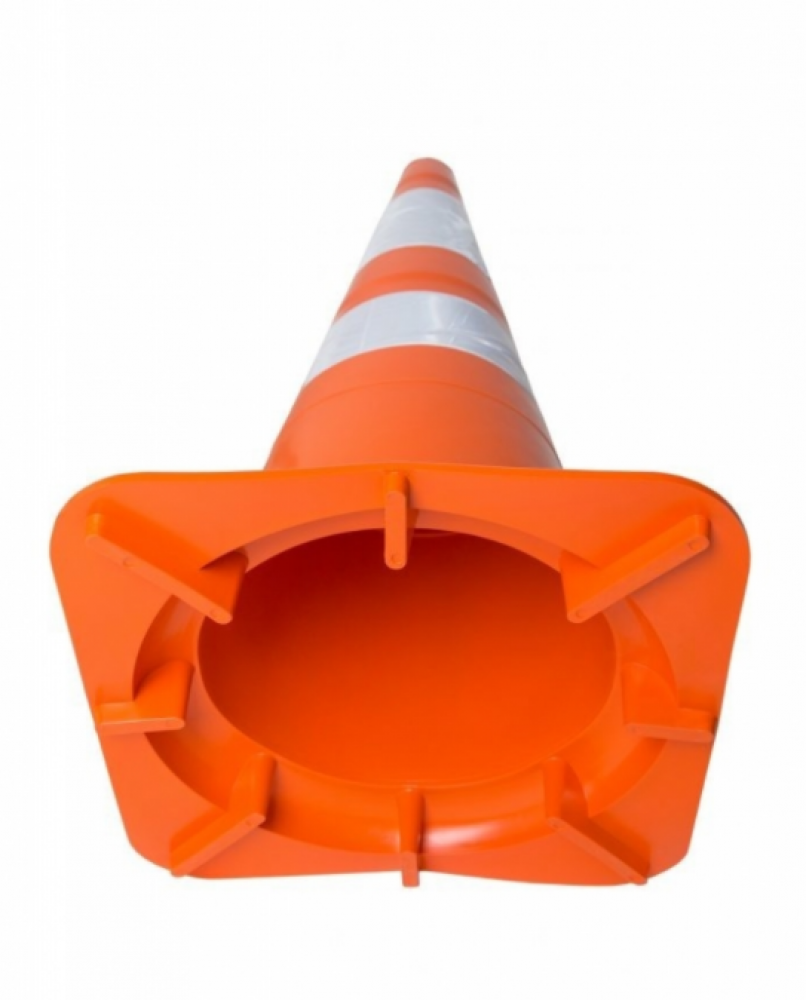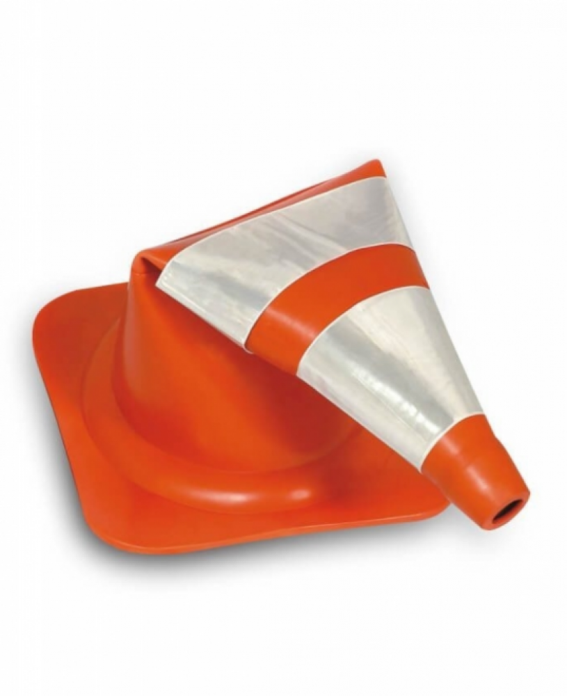 Descrição: Cone de sinalização conforme a NBR 15071/2015, fabricado em peça única, em material flexível, com duas faixas refletivas conforme a NBR 14644/2013. O Cone permite dobrá-lo totalmente ao meio sem prejuízo do seu formato original, a base do cone é composta por oito sapatas distribuídas uniformemente, possui dois rebaixos que servem para evitar o desgaste provocado pelo atrito do empilhamento.