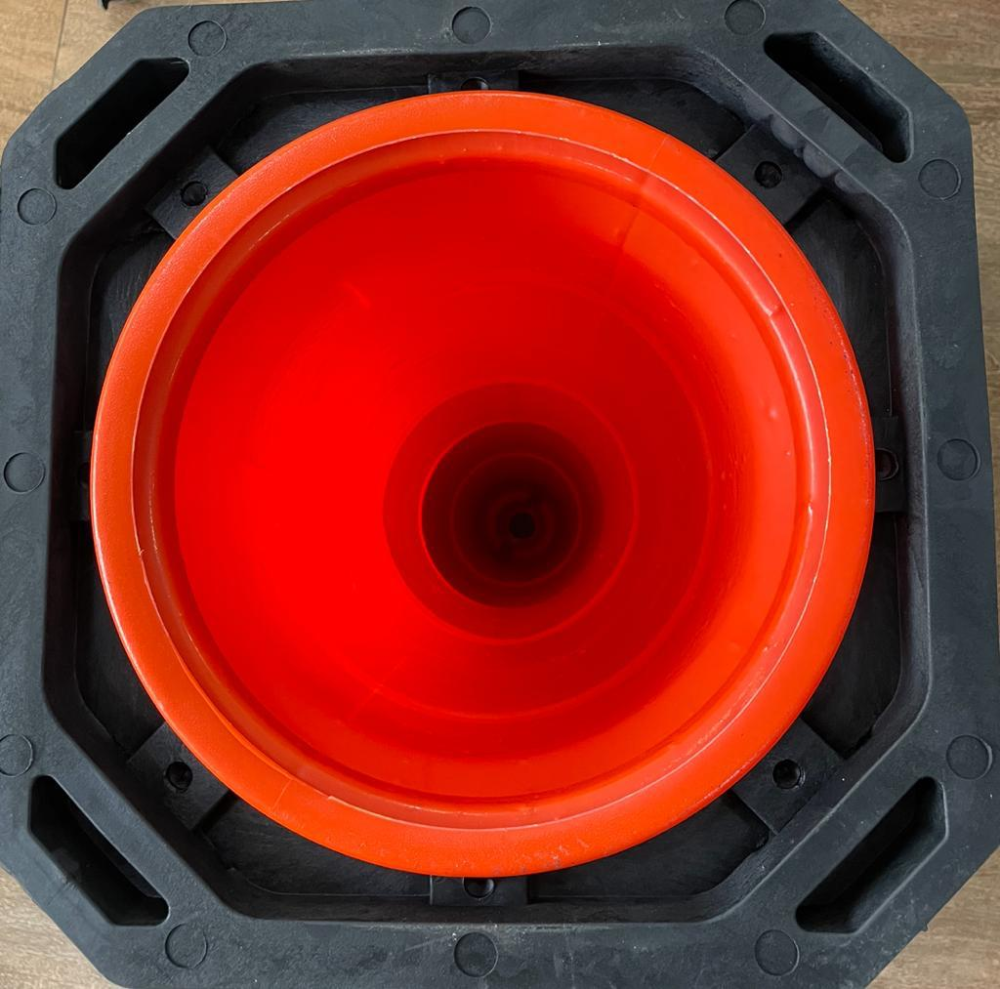 Cone para sinalização de obras e pavimentação nas rodovias,sinalização de trânsito, shoopings, estacionamentos, pedágios, fabricado em polietileno semiflexível com duas faixas refletivas, base de borracha reciclada , sendo então, composto de duas peças (corpo e base) que podem ser substituídas a qualquer tempo. Corpo cônico e base para reposição. Peso aproximado: 3,6 Kg.