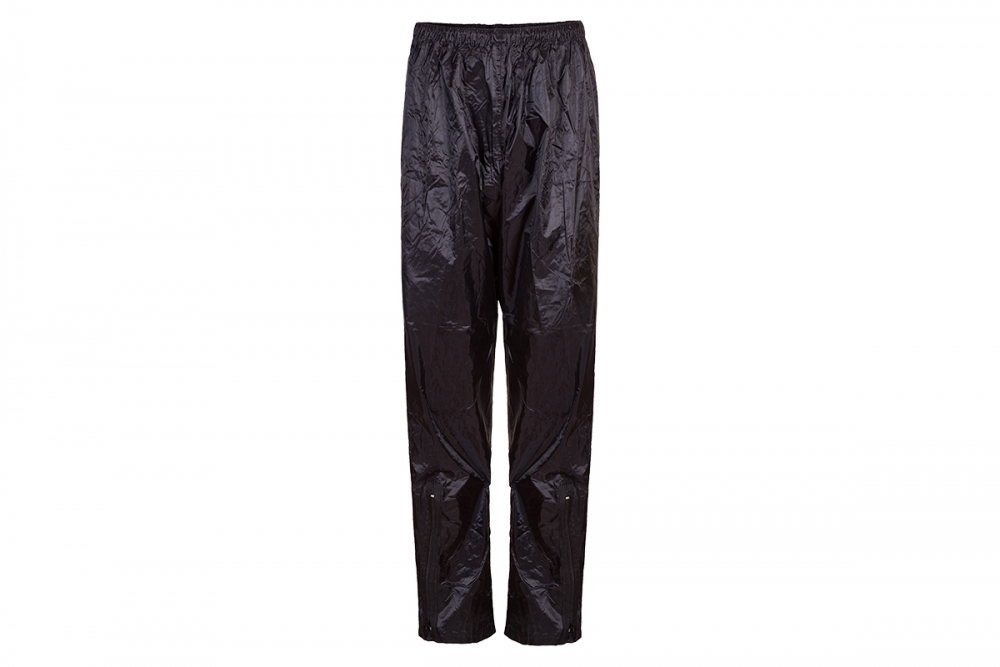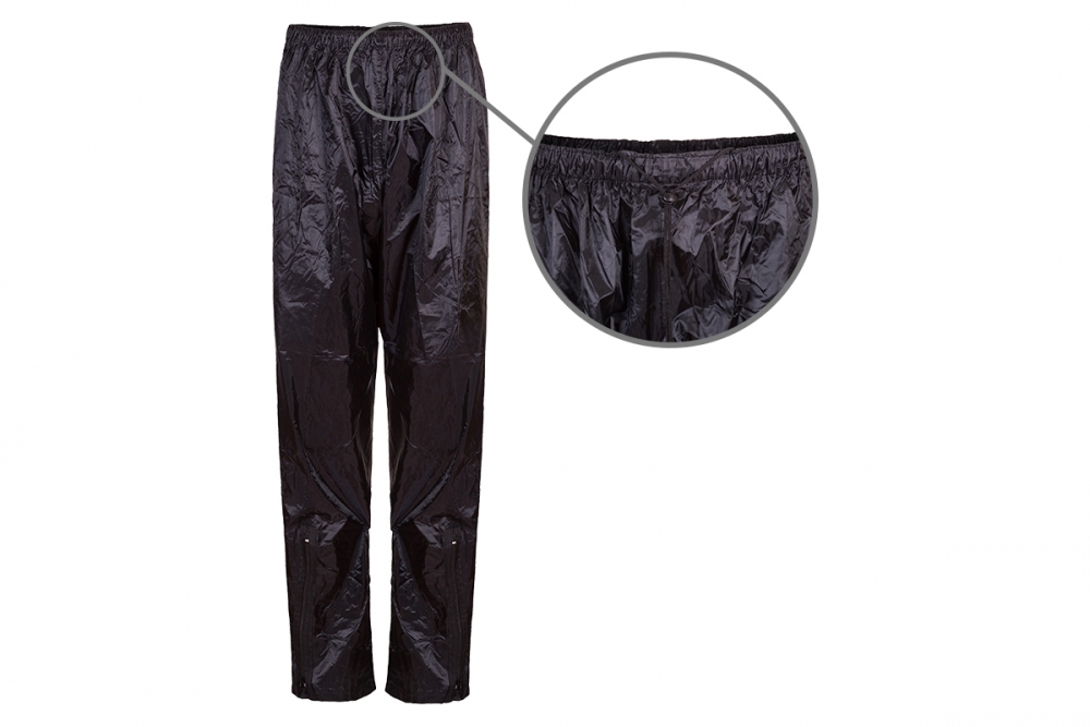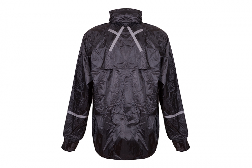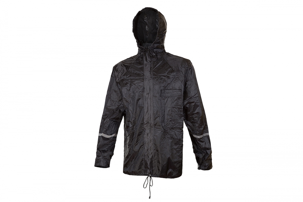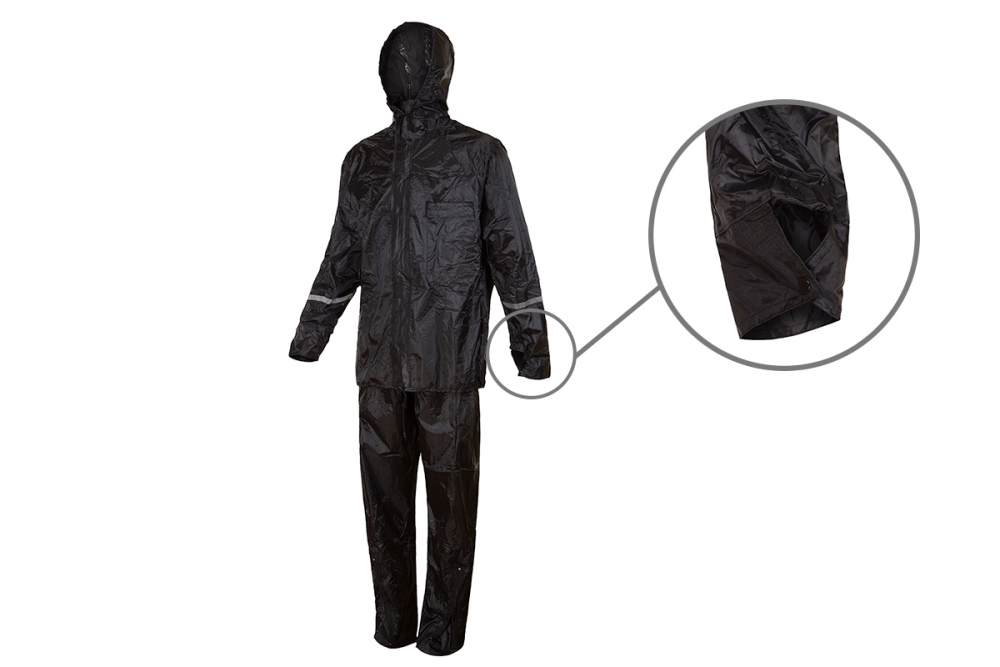 Conjunto resistente à água composto por jaqueta e calça confeccionados com forro de poliéster revestido de PVC. A jaqueta possui fechamento duplo com zíper e velcro, bolso frontal, manga com fechamento através de botões, capuz removível, faixas refletivas na parte de trás e nas mangas. A calça possui elástico e cordão para ajuste na cintura e zíper para o ajuste das barras.