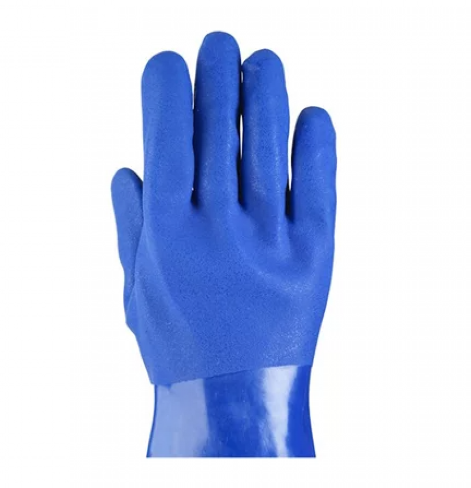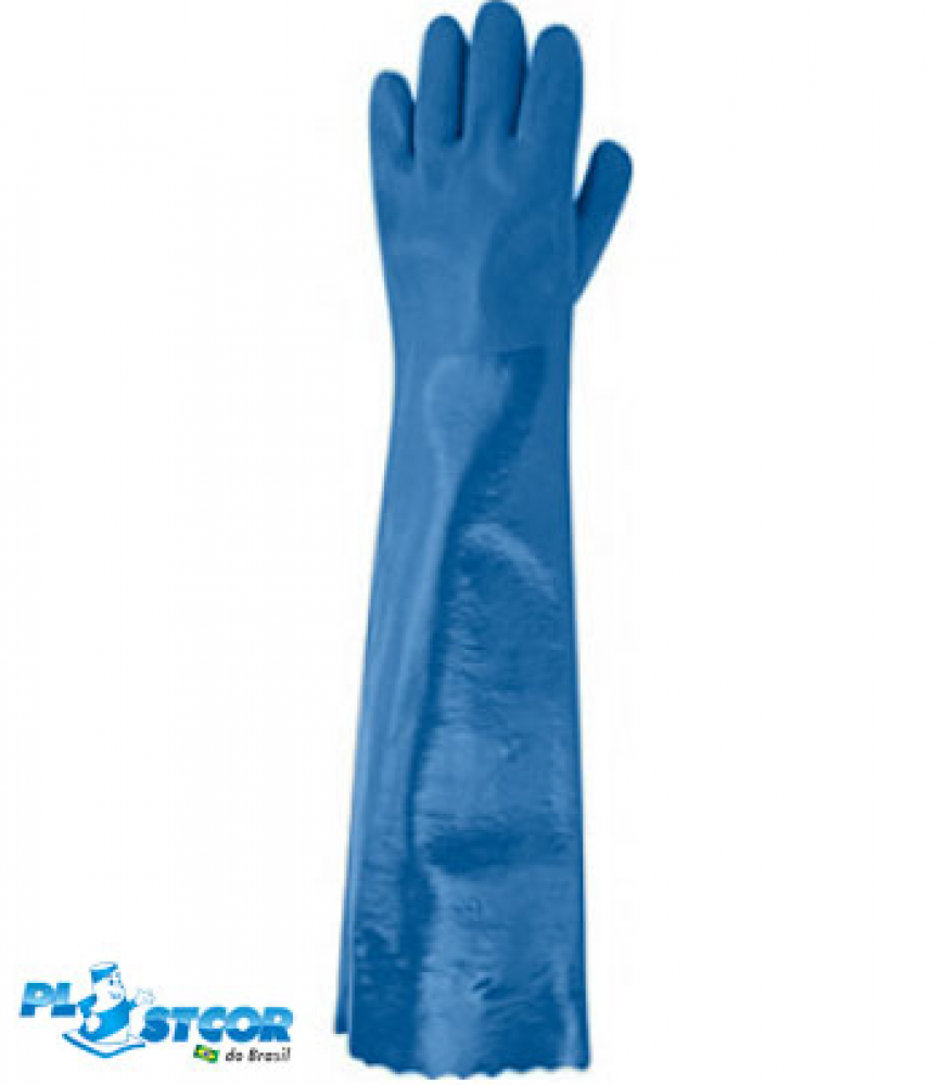 Luva de segurança confeccionada em PVC (plastissol), sem forro, com palma áspera. Comprimentos de punhos 25 cm, 35 cm, 45 cm e 60 cm.