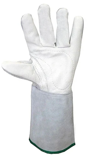 Luva de segurança confeccionada com vaqueta curtida ao Cromo cano longo em raspa (15 ou 20cm), formato de cinco dedos (forma L), com reforço na palma, reforço de costura entre o polegar e o indicador e entre os dedos anelares, costura com linha de nylon.