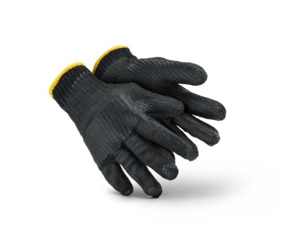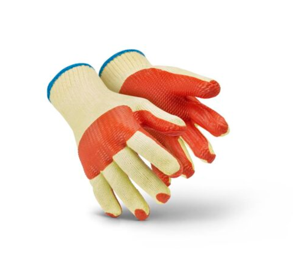 Luva de segurança, tricotada com fios de algodão, acrílico e poliamida, revestida com látex natural vulcanizado antiderrapante face palmar e pontas dos dedos, acabamento rugoso, punho com elastano, formato anatômico.