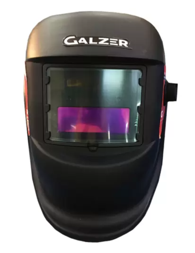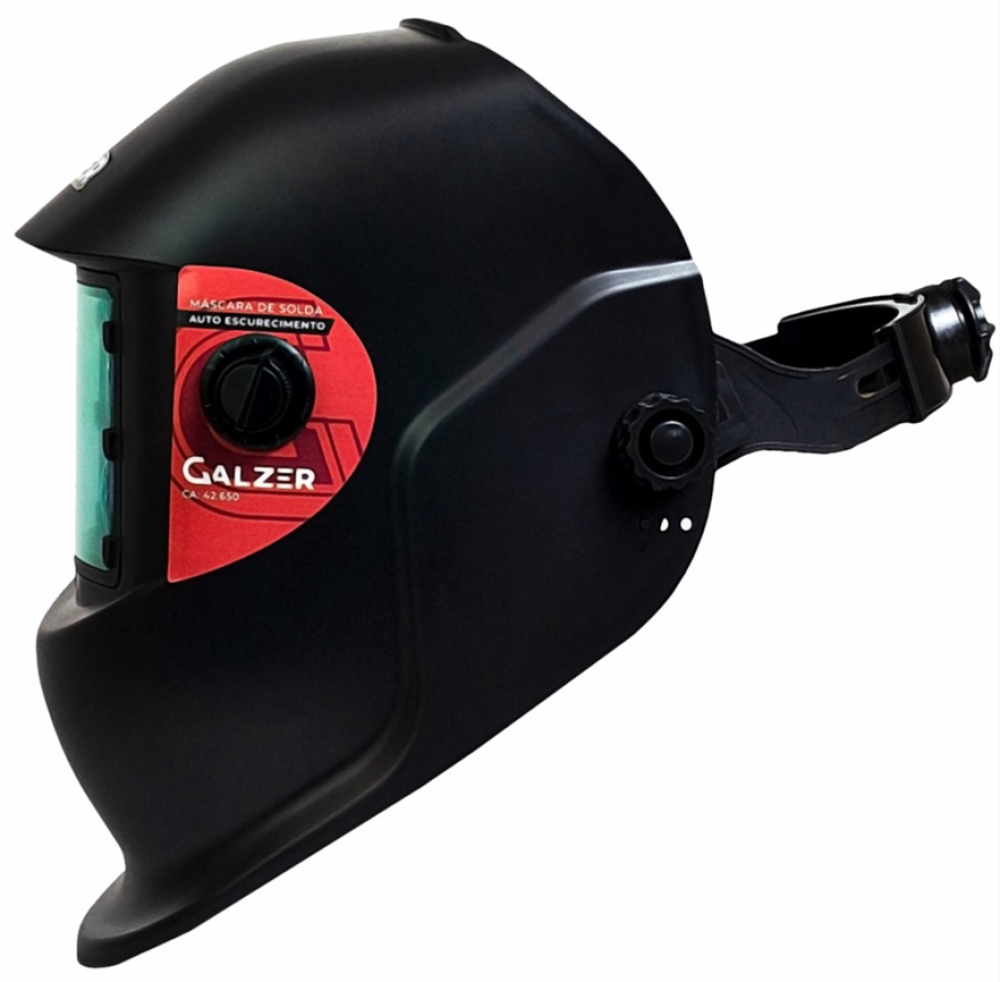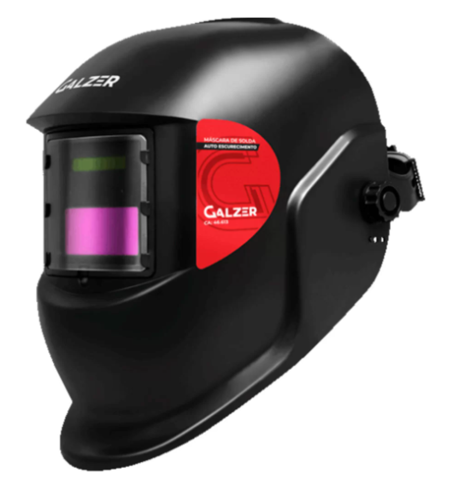 Descrição: Máscara de solda de segurança tipo escurecimento automático com tonalidade fixa, equipada com filtrotransparente (DIN 4), que varia na tonalidade DIN 4 ou DIN 13, composta de carcaça, carneira, parafusos e porcas em plástico injetado; lente frontal em policarbonato, alimentação por bateria de lítio recarregável através de célula solar. Tamanho único,com ajuste para cabeça, modelo automático. Dois modelos com ou sem regulagem.