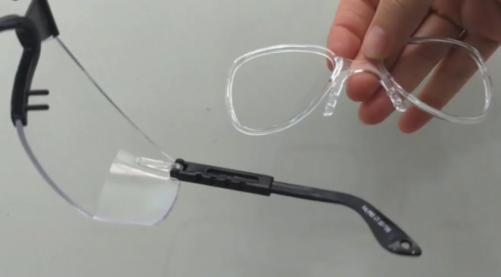 Os óculos podem ser utilizados com um suporte plástico que se encaixa internamente na canaleta do apoio nasal para a colocação de lentes corretivas.