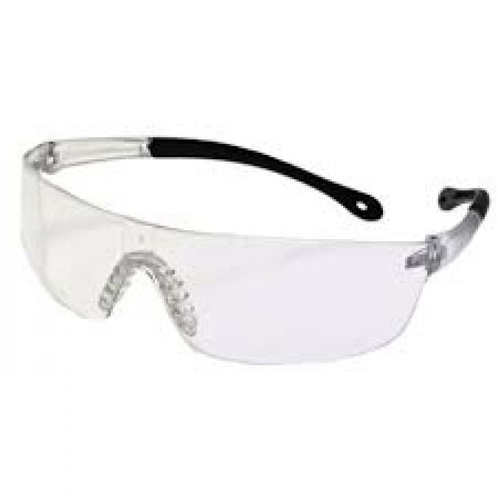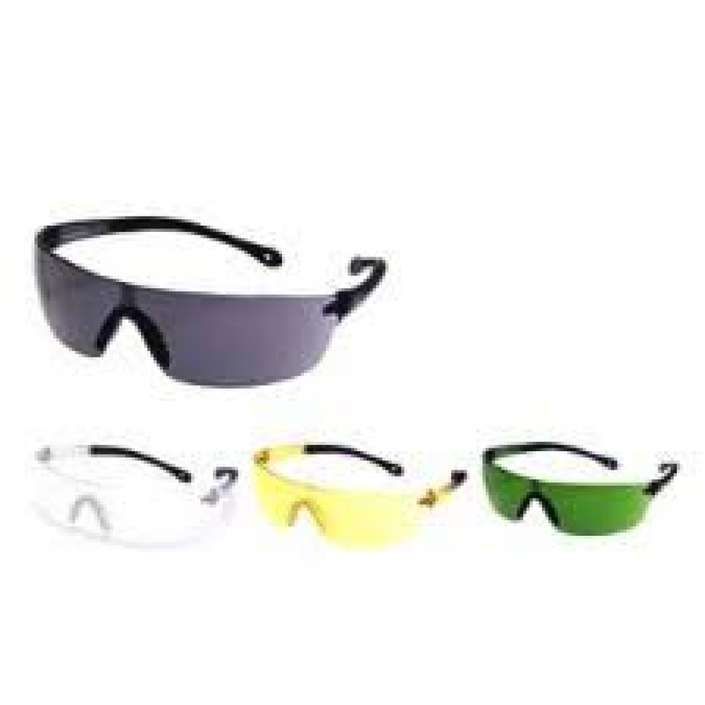 Óculos de segurança com armação e visor confeccionados em uma única peça de policarbonato cinza com revestimento externo de filme prateado espelhado e cinza com revestimento externo de filme prateado espelhado, com cinco pinos localizados na posição do nariz, utilizados para o encaixe do apoio nasal de plástico maleável e hastes tipo espátula, confeccionadas do mesmo material do visor e com acabamento emborrachado, articuladas na armação por meio de parafusos metálicos. Cor da Lente incoloramarela,verde e Fumê.