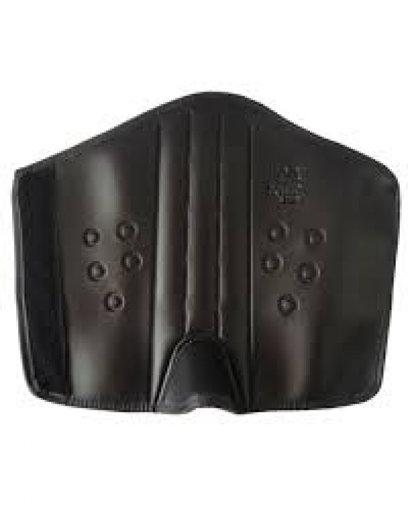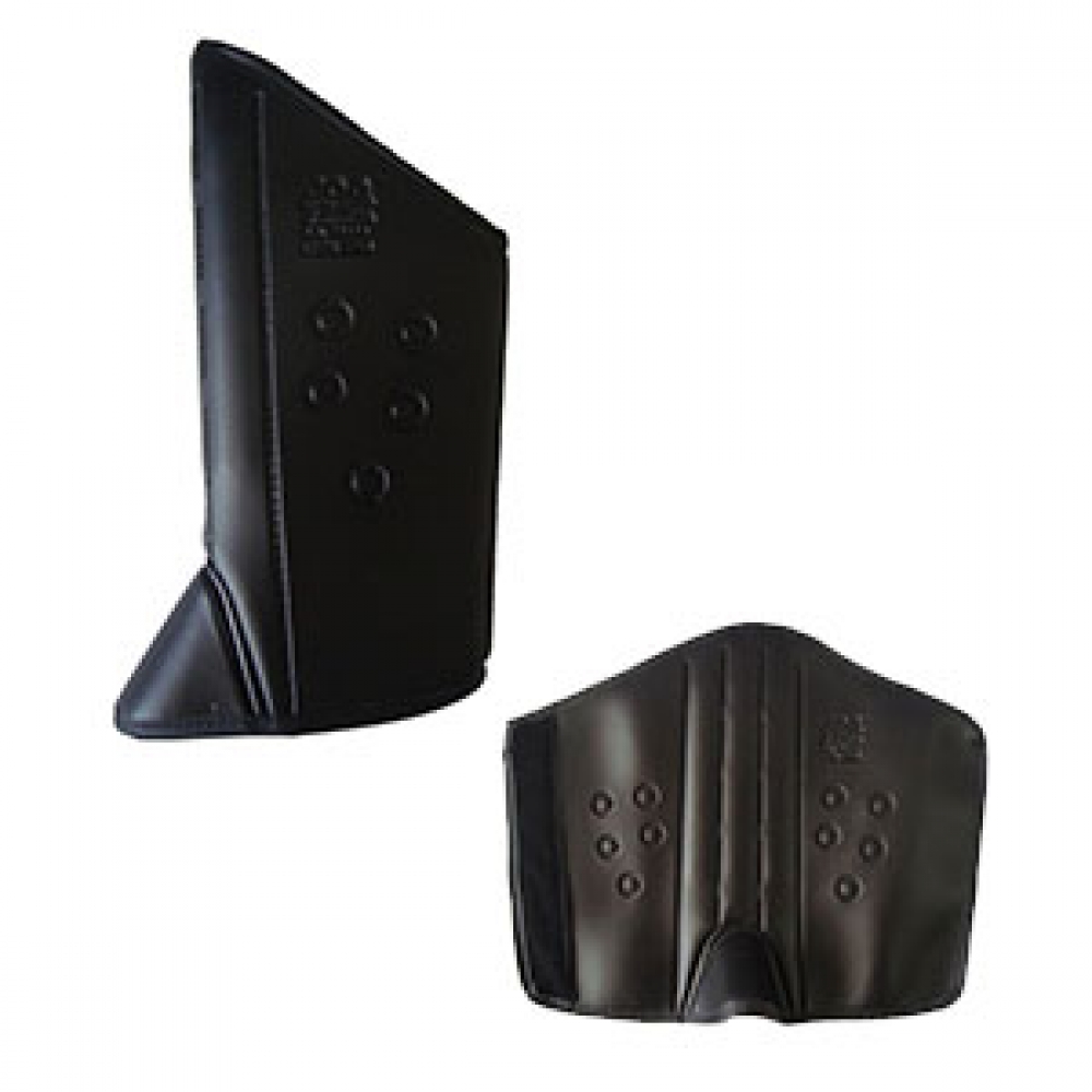 Perneira de Segurança confeccionada em duas camadas de material sintético, fixadas através de solda eletrônica; três hastes de polipropileno na parte frontal, costuras de viés nas bordas para arremate, fechamento traseiro através de velcro.