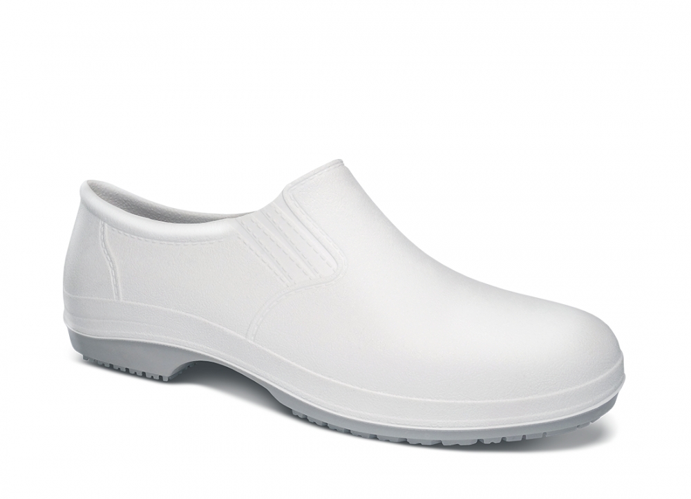 Calçado ocupacional de uso profissional, tipo sapato, fabricado com cabedal em material polimérico – (PU) na cor branca e solado de poliuretano bidensidade na cor cinza, resistente a hidrocarbonetos, antiderrapante (SRC) resistente a absorção de energia na área do salto.