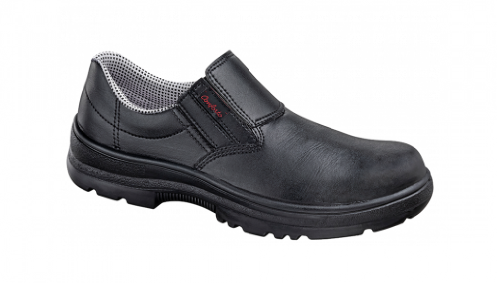 Calçado ocupacional baixo, tipo sapato, confeccionado em microfibra hidrofugada, com fechamento através de elástico. Palmilha de montagem e forro interno em material de não tecido. Construção no sistema strobel com solado injetado bidensidade PU, com resistência ao óleo combustível.